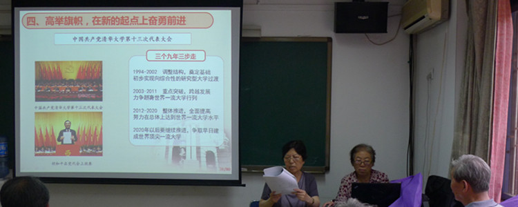 离退休党支部书记姚文老师首先做“深入学习党的光辉历史,传承清华党组织优良传统”主题党课。党课以时间为线,选取重要人物和关键事件描述了清华园党组织90年的发展历程。乱世有所守,盛世有所为——清华人的“红色气质”再次感染在座的每一位党员。