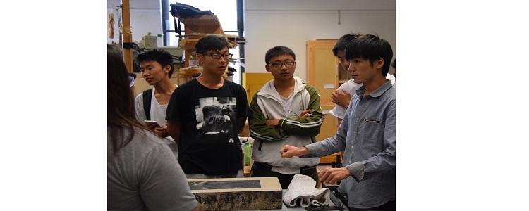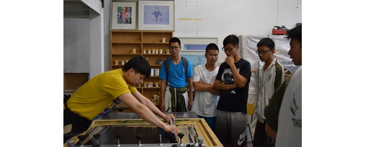 同学们从一楼进入工艺美术系的金属工艺实验室和陶瓷艺术两个大型实验室。在金属工艺实验室,同学们还主动尝试了一些活动。随后,来到三楼的工房实验室,参观了工业设计系的综合模型实验室、服装设计系的织绣工艺实验室、染织设计系的印染工艺实验室、绘画系的版画工艺实验室等等。参观过程中,专业的技师为同学们讲解了工房实验室的主要研究方向和教学情况。