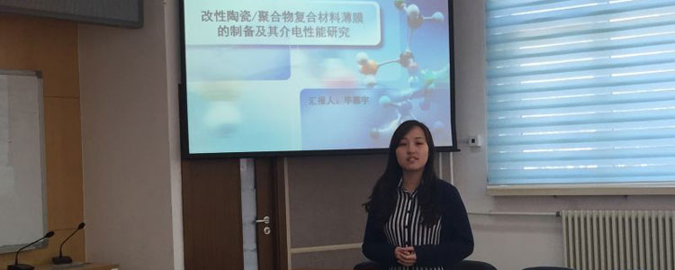毕嘉宇老师根据自己的研究经历介绍了复合材料薄膜的制备及其介电性能方面的研究。