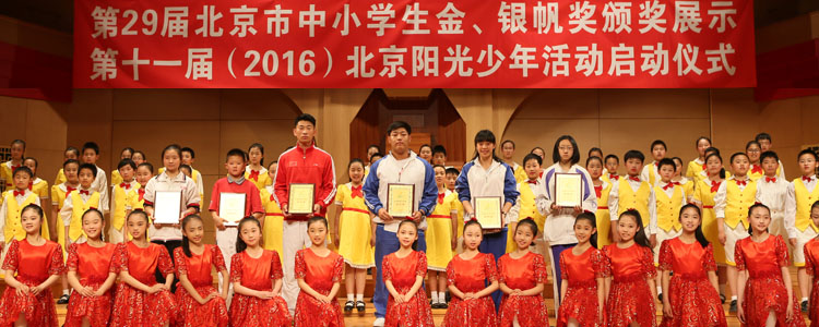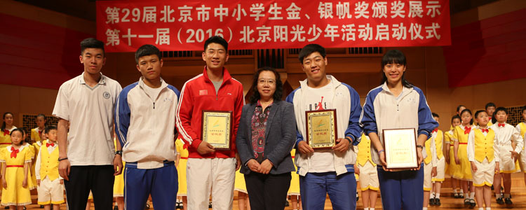 4月28日下午,“第29届北京市中小学生金银帆奖颁奖展示暨第十一届(2016)北京阳光少年活动启动仪式”在北京市三十五中金帆音乐馆举行。bg真人娱乐11名学生获得“2015年北京市中小学生金银帆奖”,其中,高1401班何淼格(2015年世界中学生田径锦标赛女子400米冠军)、王谈(2015年世界中学生田径锦标赛男子铅球冠军)、戎成文(2015年世界中学生田径锦标赛男子标枪冠军)三位同学获得“金帆奖”。