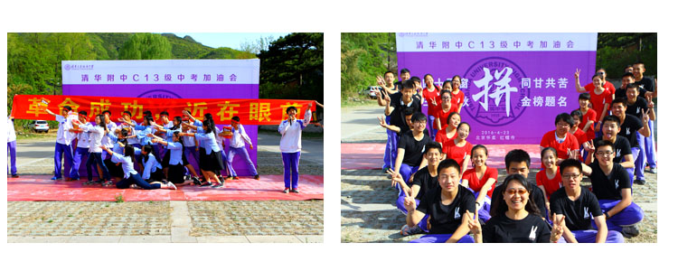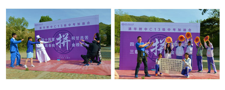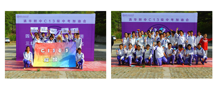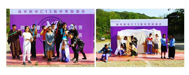 初三中考加油会以为各班拍摄“定妆照”的形式进行。活动之前,各班由学生与班主任自由头脑风暴,设计出本班加油会“定妆照”的主题与造型,在活动上现场展示。各班依次展示本班的“中考加油定妆照”造型,不仅展示出全班同学对中考的热情,对金榜题名的信心,更体现出初中三年积淀下的真挚的同窗谊与深厚的师生情。