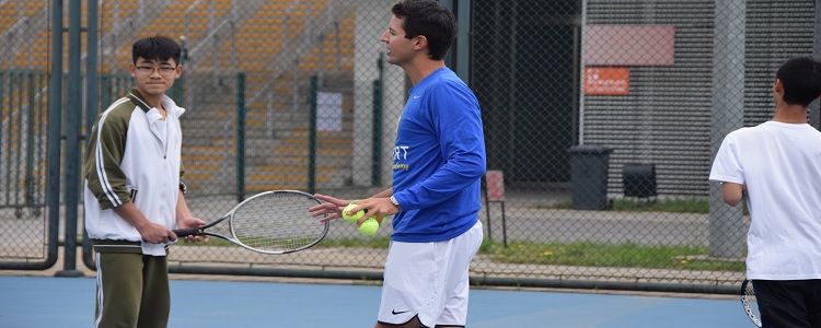 随后,全体人员走出阶梯教室,来到网球场进行户外课的开展。在中方优秀网球教练的带领下,同学们体验了诸如“king”“接龙”等多种多样全新的网球训练方式,同学们都全身心地投入,认真对待每一次挥拍与击球,球场上传出一阵阵的欢呼声。