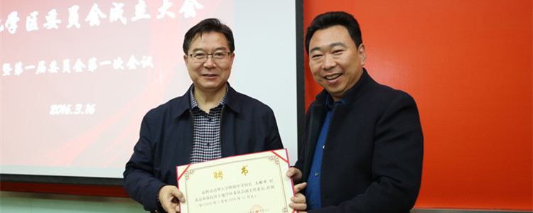 海淀区学区制改革工作小组组长、海淀区教委副主任张彦祥(右)为上地学区副主任委员、bg真人试玩校长王殿军颁发聘书