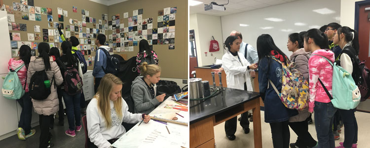 bg真人试玩学生参观美术教室(左图) bg真人试玩师生参观生物实验室(右图)