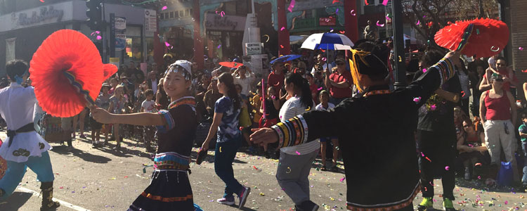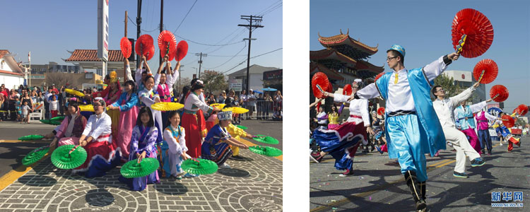 bg真人娱乐学生交流团队紧随中国驻洛杉矶领事馆的花车第一个出场,伴着优美激昂的旋律,随着变幻的扇色和队形,跳起一支代表中华56个民族团结友爱的舞蹈《爱我中华》。在鞠红老师和张毅老师的精心排练下,同学们表现出色,将各民族的风情特色和华夏民族的团结统一在歌舞中表演得淋漓尽致,赢得观众一片欢呼叫好,场面壮观、反响极为热烈!随后动听婉转的中国经典民歌《茉莉花》音乐响起,同学们手执花扇变换出五彩斑斓的颜色,队列整齐有序,沿途围观群众无不欢呼致意,演员们和观众热情互道新年快乐,气氛其乐融融。