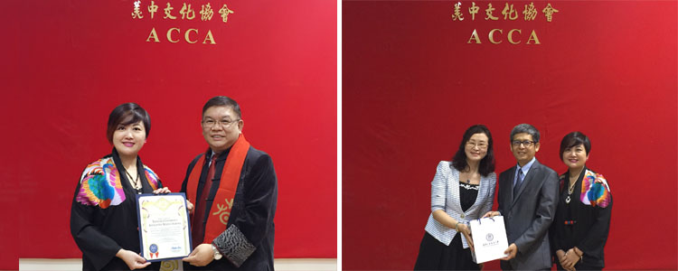 鞠红老师(左图左)代表学校接受阿罕布拉市市长沈时康授予的荣誉证书 张姝敏(右图左1)、鞠红(右图右1)向中国驻美国洛杉矶总领事王学政赠送纪念品