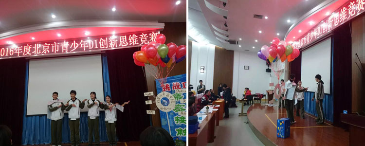 11月28~29日,2015-2016年度北京市青少年DI创新思维竞赛在北京市第19中学举办。bg真人试玩三个代表队18名同学参赛,均取得了良好的成绩,其中Zing队在“亲密接触”试题的比赛中,取得了高中组第3名的好成绩,并将代表北京参加DI全国赛。参加“变化步调”试题比赛的Eternity队和参加“伪装大师”试题比赛的Twinkle队分别取得了高中组第5名和第7名的成绩。