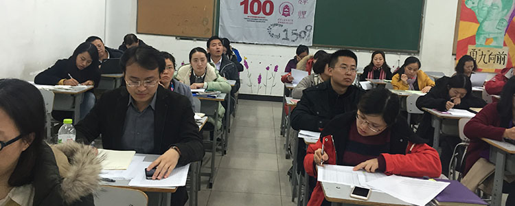 成绩分析会现场,教师们认真聆听备课组长的总结