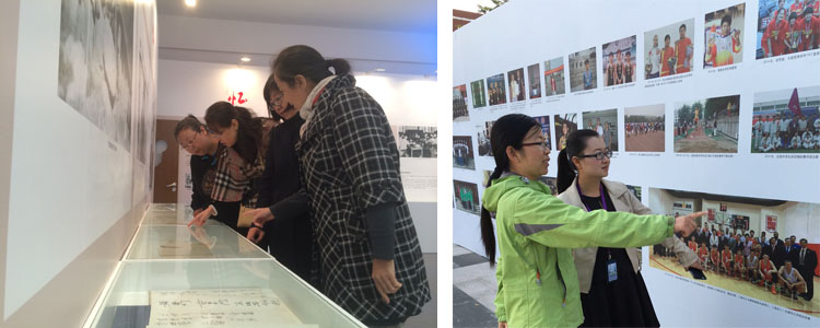 老师们认真观看展品(左) 老师们在《流金岁月》系列展板前驻足(右)
