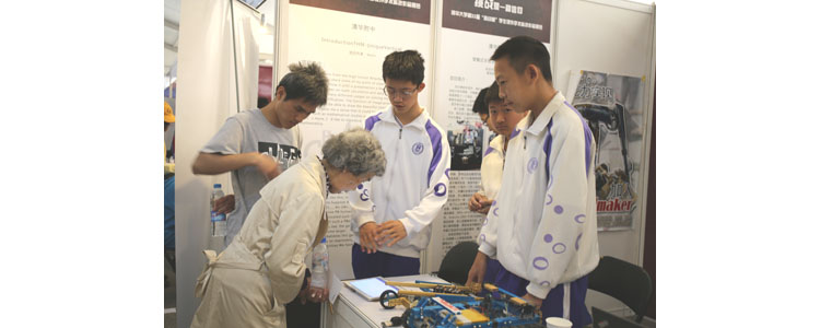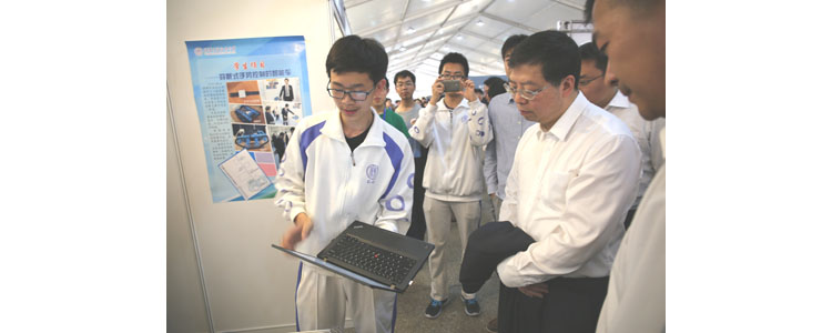 左润泽同学为清华大学原校长顾秉林(左2)介绍项目