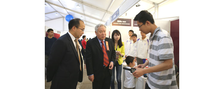 2015年4月25日至26日,清华大学第33届“挑战杯”学生课外学术科技作品展览(简称“挑战杯科展”)在清华大学成功举办。bg真人娱乐创客空间左润泽、张亦弛、刘晓义、刘玥含、黄思语、胡泽涵等十余名学生受邀参加了本次科展,向本次科展的参观者们介绍bg真人娱乐创客空间的科技成果。其中,“手势操控智能车”“形独”等项目受到参观者好评和肯定。清华大学校长邱勇在参观时表示,应该积极鼓励同学们的科技创新,鼓励他们勇于将创意变成现实,培养更多的科技人才。