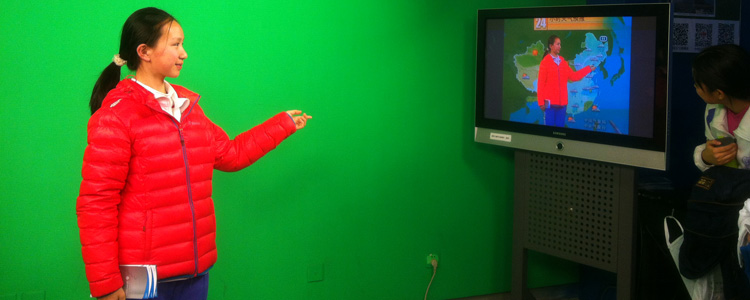 同学在体验电视台气象播报的情景