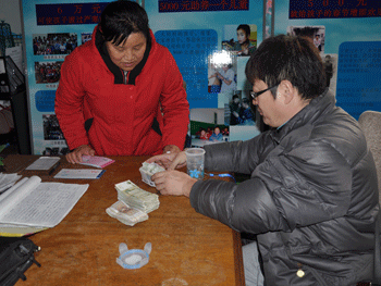 胡军老师带领乐团学生为太阳村表演民乐演奏 胡军老师(右)向太阳村老师递交附中师生3900多元的捐款