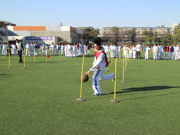 本次活动特别邀请体育组老师制订比赛规则:撞到杆一定要扶起来,若球运丢了,捡回后必须要回到丢球位置;明确每位班级上场十男十女,接力传球。比赛过程中大家表现非常出色,女生运球平稳,速度较快,初有技巧;男生运球飞速,勇敢无畏,奋勇争先。
