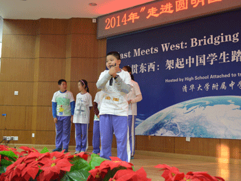 展示会首先呈现了课程在实施中取得的成绩和得到的社会认可,接着大家共同回顾了本课程的三个阶段:“认识圆明园”、“体验圆明园”和“思考圆明园”。初13级的张末未、王莛然、刘思雨、张子晗、赵鉴开等同学分别就这三个阶段畅谈了自己在课程当中的收获和感悟,涉及到建筑、数学、古文、美学、历史等多学科的学习体验,并且对初14级的学弟学妹们提出了自己的希望和建议。最后,赵鉴开等5位同学表演了题为“历史也有范儿”的表演,用轻松诙谐的方式展示了他们对农业与圆明园关系的理解,引来了现场的阵阵掌声。