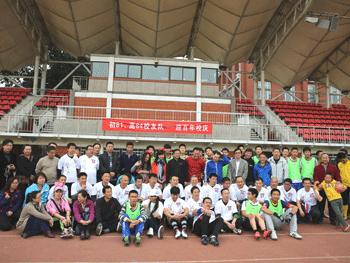解巨钊副校长(右1)为百年校庆百米接力启动仪式鸣发令枪 解巨钊副校长(居中)与全体队员合影留念 1