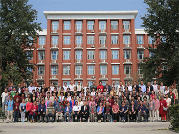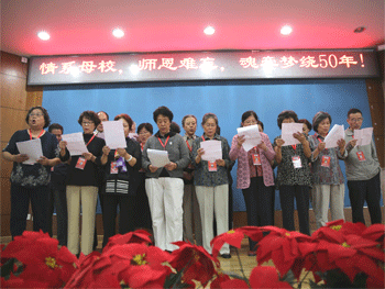 在感谢师恩的时刻,老师们被请上主席台,校友们向他们一一赠送礼物再次表达对老师的谢忱,老师们的致辞如此亲切,个性仍如往昔,教诲历历在目。接下来的班级代表发言让所有的人动容,校友们深切怀念了初643班的校友史铁生。著名校友克明朗诵《我的圣殿 我的少年》,部分校友代表上台共同演唱王玉田老师作曲的《我们要做共产主义接班人》,会场气氛热烈。会议结束后,全体参会人员到主楼前合影留念,随后到附中食堂用餐,下午各班分别活动。
