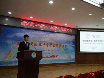 大会在国歌声中开始;第十八届学生会主席陆欣宇同学作了题为“行动中改变,思考中成长”的年度工作报告,总结回顾了过去一年学生会的主要工作成绩和成长;学生会干部代表、外联部部长施佳烨同学回顾了所有学生会成员一年中的故事和感悟,情深意切,引起了老师和同学们的共鸣,学校领导为即将“退休”的高三学生会干部颁发了证书和纪念品,感谢他们一年来的辛勤工作。