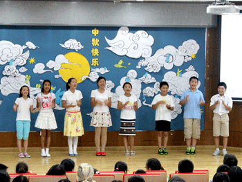 小学部的联欢会以《月亮,听我说》为题。在中文老师的精心组织下,每个年级的每一位孩子都得以呈现自己的节目。一曲《小小的船》唱出了一年级学生心中的月亮美,一首首月亮诗是二年级追寻古人的脚步,一句句祝福是三年级送给家人的礼物,一篇篇美文描绘了四年级心中的月亮,而八份精美的PPT则是五年级孩子带大家遨游的中秋的传说与习俗。