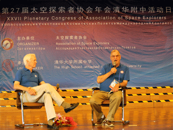 随后,宇航员前往报告厅,参加面向全体高一学生的报告会。在报告会上,bg真人娱乐校长王殿军首先致辞,讲述了明朝时期的万户尝试利用火箭制作飞行器,结果因火箭爆炸而献出生命的故事,鼓励台下的同学们未来从事航空航天事业。接下来宇航员向同学们介绍了他们从最开始被选为宇航员,接受培训到最后进入太空的历程,John更是幽默地表示:“成为一个宇航员,你需要长的很帅,比较聪明,运气也要不错。我长的不像Schweickart那么引人注目,脑子也不聪明,但我还是被选成了宇航员。”引得台下传来阵阵欢笑。两位宇航员还展示了当时在太空中拍摄的照片、用眼镜模拟航天器向学生解释了失重的原理。在互动环节中,台下的学生们也用英文向宇航员提出了许多有意思的问题,例如“在太空你们有什么消遣的活动吗”、“在太空中你们都可能遇到哪些危险”,宇航员也对这些问题一一进行解答,现场的气氛达到高潮。在提问的过程中,同学们增长了见识,了解了现在航空航天领域最前沿的技术,也拉近了同学们和宇航员之间的距离。
