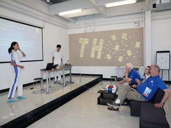 下午,宇航员一行来到了bg真人娱乐创客空间,对创客空间的环境设施以及同学们的活动进行深入的参观和细致的了解。首先,宇航员们在门口的展板宣传区对创客整体的项目情况进行了粗略的了解,随后进入创客空间听取了学生报告。一行人首先听取了同学关于创客特色课程——极限挑战课程(简称XLP)的介绍。XLP课程主要分为两组,教师和经选拔参与准备教学内容的学生是“挑战方”,他们的共同任务是设计一系列具有挑战性的学习任务,交给“任务方”,以培养“任务方”同学们的时间管理能力、团队协作能力、跨学科团队协作能力、项目控制力、公民意识、创新意识以及法律意识等。同时,创客空间成员也介绍了一种XLP群体认知课程的经典事例——原子力显微镜,给大家呈现了如何去实现群体认知课程。随后在美国宇航员一行人的参与下,创客空间举行了一次新产品发布会,新产品主要包括能通过感应人的挥拳动作来判断是否已经清醒的拳击闹钟;能够根据蓝牙信号自动跟踪目标的智能跟踪车;还有为了解决公共活动场所有时不得不找专人借钥匙的麻烦,而开发的无需对门锁进行任何改装的“any智能密码遥控开锁器”。随后,宇航员们又听取了创客空间成员的“天宫二号实验方案”等报告。在对创客空间目前情况的介绍完成后,创客空间的成员又向宇航员们介绍了对于未来的展望,例如创客空间计划在10月1日启动的“智能生态园主题XLP课程”等。在参观创客空间时,宇航员们对于创客空间的部分项目表现出了很大的热情,同时也询问了相关项目组一些细节方面的问题。