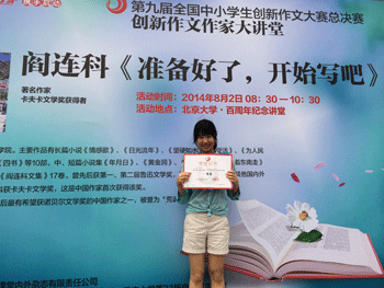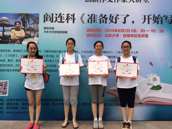 8月1日至2日,“第九届全国中小学创新作文大赛”总决赛在北京大学举行。bg真人娱乐初一、初二、高二共10位学生参赛并全部获奖。其中,高1201班刘珂昕荣获高中组一等奖,高1210班满元、高1203班刘思麟、高1204班韩槟如、高1206班赵梓汐同学荣获高中组三等奖;初1211班何楚彤、初1201班高誉文、初1213班尹昕儒、初1311班张可、初1308班方心仪荣获初中组二等奖。高中组获得二等奖及以上奖项的同学将享有北京大学、南京大学等30余所大赛联合高校中任一所2015年自主选拔测试推荐资格。
