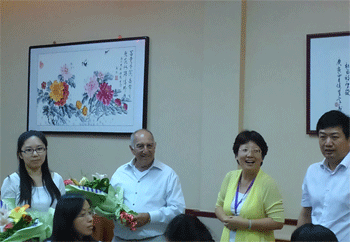 峰(右1)为保罗博士(左2)献花表示感谢