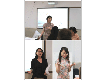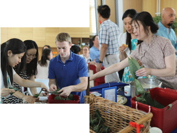 活动围绕“如何将中国文化融入到中文教学中”的核心问题展开。八位中文老师用中英文分别从创设富有中国文化特色的教室环境,中国古典诗歌的重要地位、中国古典诗歌在对仗和节奏上表现的音乐美,中国文字的演变和书法的魅力等几方面进行了讲解与展示。在整个活动的过程中,伴随着《渔舟唱晚》的美妙音乐,外教们时而在问答中沉浸于中国古典诗歌的情蕴之美,时而在游戏中臣服于古典诗歌的对仗之美,时而在击鼓诵读中惊叹于《笠翁对韵》的节奏之美,时而在泼墨挥毫中尽享中国文字和书法的变幻之美。而在课堂展示结束之后,结合中国传统端午节的到来,全体教职员工还去教师休息室参加了中文组精心准备的小型端午文化宴。在屈原故事的娓娓讲述以及包粽子的亲身体验中,全体教师意犹未尽地结束了当天的中国文化之旅。