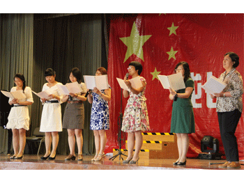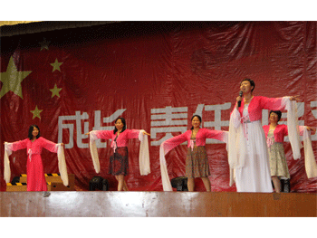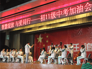 中考加油会分为班级展示、乐团助威、教师表演三个部分。首先播放了各班同学精心制作的ppt或flash,通过照片、视频等形式展示了三年以来学校历次大型活动及日常生活学习中大家的欢笑与成果,配以动听的音乐及感人的文字,充分展现了各班风采,时而将同学们带入回忆,时而激发大家的斗志。接着由民乐团演奏了《龙腾虎跃》,激昂的鼓点,欢腾的乐曲,缓和了同学们毕业带来的感伤,更坚定了大家努力的决心。最后,各备课组老师们的表演将动员会推向高潮,语文组的诗朗诵,数学组的歌曲,物理组的舞蹈,化学组的三句半和英语组的配音表演都为同学们带来了阵阵欢笑。