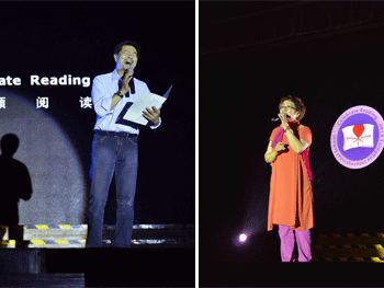 本次朗诵会循着阅读进阶的脉络,重温了儿时背诵的各种名家诗词美文;用中文、英文、法语、波兰语以及西班牙语等多种语言共同演绎了充满童真和爱心的绘本故事;此外,学生和老师们自己创作的中英文诗歌、散文、演讲辞和相声也纷纷一展风采。在师生和家长的表演之外,著名表演艺术家濮存昕也亲临现场,声情并茂地朗诵了《琵琶行》,赢得观众的阵阵掌声。国家一级演员、著名歌唱家谢莉斯也受邀到场献唱了《外婆的澎湖湾》等经典歌曲。此外,相声表演艺术家姜昆、著名主持人许戈辉和春妮等也发来视频以表支持,足球运动员邵佳一还向活动赠送了签名球衣和足球供现场拍卖。