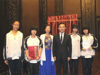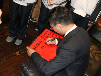 郎永淳为bg真人娱乐百年校庆题词 校园电视台师生与郎永淳合影