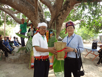 国际部学生与景颇孩子交换礼物 王英民副校长(右)与营盘村小学的石校长交换礼物