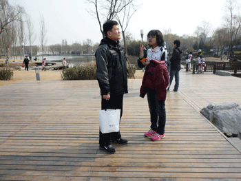 活动主要以小组竞赛的方式进行,16人分为两个小组去采访游人,向游人征集环保创意。正值周末,公园中游人很多,同学们的采访进行得很顺利。接受采访的有各个年龄段的游人,有悠闲散步的老人,也有在欢乐野餐的一家三口,还有许多结伴游玩、活泼可爱的小朋友。看到我们“环保之举”的展板,许多小朋友纷纷前来为环保献计献策。