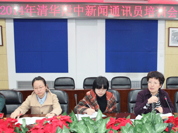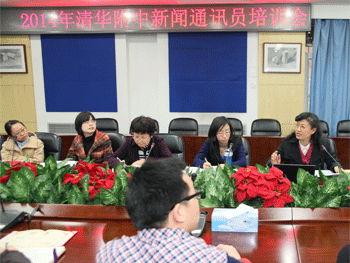 张洁副书记(右1)讲解新闻通讯员职责等 高岷老师(右1)做新闻写作培训