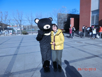 同学与熊造型卡通人物合影 高中楼义卖摊位