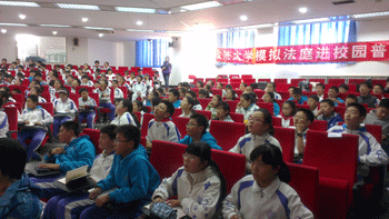 大学生们举行了一场由于开玩笑引起的校园伤害案件为主要内容的模拟法庭审判。通过对校园案件的还原、庭审、讲解、互动交流,在这个过程中让中学生们感受到“学法、懂法、知法、守法”的重要性。