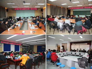 方妍书记主持开幕式(左上);王殿军校长作报告 工会主席张洁(左上)、提案组长徐文兵作报告