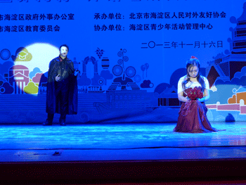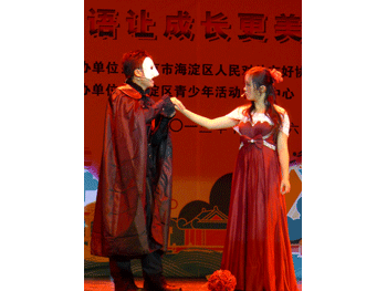 11月16日下午,主题为“海淀与世界同行,外语让成长更美好”的2013年北京市民讲外语游园会海淀分会场活动在海淀区青少年活动管理中心礼堂举办。应海淀区教委的邀请,bg真人娱乐音乐剧社学生高11级张明达、谢毅敏、贾薇茜、王佳宁、高13级崔天奕在音乐教研组鞠红老师的带领下参加了演出,演出的节目是英语短剧《剧院魅影》中《唐璜》片段,节目以真挚的情感,动人的场景以及bg真人娱乐学生扎实的外语功底,获得了与会领导以及现场观众的热烈掌声。