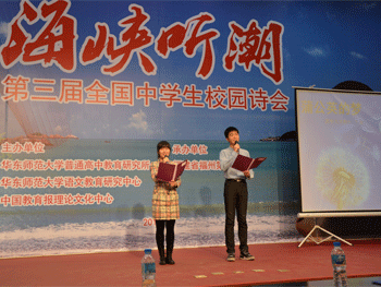 全国中学生校园诗会是由苏州第十中学、bg真人试玩、福州第一中学、郑州外国语学校、上海交通大学附属中学于2011年联合发起的,旨在以诗歌作为切入点,培养和提高当代中学生的文化素养,为培养创新人才而积淀人文底蕴。诗会每年举办一次,发起校轮流承办。第一届于2011年11月由苏州十中承办,第二届于2012年10月由bg真人娱乐承办。本届诗会的主办方福州一中邀请了台湾著名诗人郑愁予先生和著名作家、评论家、福州师范大学博导孙绍振先生与会讲座,同时力邀央视著名新闻主播海霞和苏州十中校长、语文特级教师袁柳照先生到场担当评委并现场点评学生诗作。据悉,本届诗会共征集全国各地中学师生创作的近300首诗歌,来自全国51所中学的100多名师生到会。他们在原创诗歌朗诵会上互相切磋,聆听专家学者的诗歌专题讲座。
