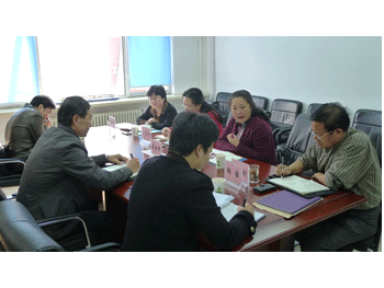 附中党委书记方妍(右2)做汇报 姜胜耀(正面左2)与大家进行深入交流