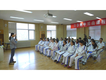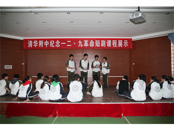 纪念一二•九革命短剧排练课(档案室摄影) 京昆课堂上学生模拟昆曲《牡丹亭.游园》(德育处摄影)