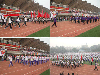 29日上午,在学生田径比赛项目全部结束后,校足球队的同学们进行了一场精彩的表演赛。闭幕式上,校领导为在入场式、广播操、文明观众、田径比赛等方面获得集体奖的班级颁发奖状。教务处主任朱培主持闭幕式。