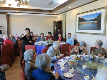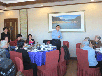 王殿军校长(立者右)致辞 主管副校长赵鸿雁(立者)向老教师祝贺节日
