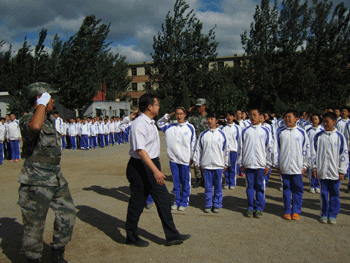 同学们接受检阅 王殿军校长(前左1)和杜毓贞副校长(前 右1)为军训基地赠送锦旗
