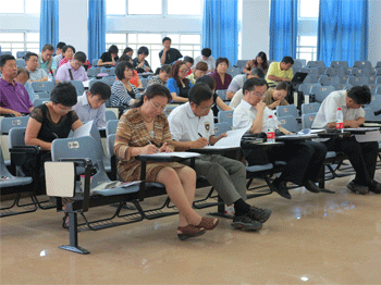 特级教师、市级学科带头人及中层干部考核现场 考核述职大会上评委在听取个人述职