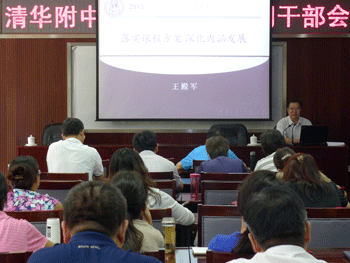 清华大学副校长谢维和(左1)与附中教师互动 附中校长王殿军(正面)作内涵发展专题报告