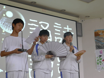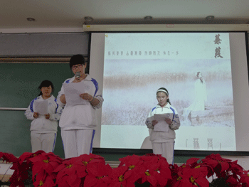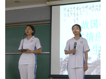 “借问人间愁寂意,伯牙绝弦已无声”——三位小主持人用充满诗意的开场白拉开了活动的序幕。美丽哀怨的《蒹葭》,在一袭白裙的女生长笛演奏中,诗意收尾;引人遐思的《陌上桑》,在蓝裙姑娘们的柔美舞姿中,诗意展现;最是那一首《念奴娇.赤壁怀古》,荡气回肠,历史的宏大战争场面似乎就在眼前。小组朗诵或婉约或豪放,让台下同学们大饱耳福,现场掌声阵阵。其间各班的集体朗诵,场面壮观气势恢宏,也掀起了一个又一个的小高潮。
