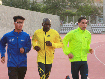 bg真人试玩学生于海涛(左1)与国际名将一起热身 19日参加“世界田径日”中学生挑战赛的bg真人试玩学生