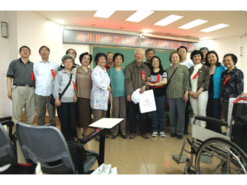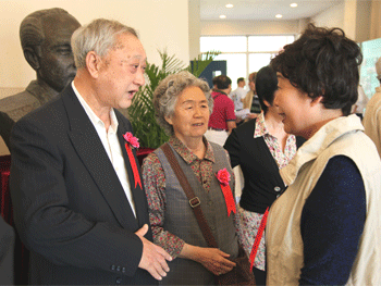 与当年的班主任老师冯玉中(前中)合影 老领导韩家鳌(左1)与校友交谈