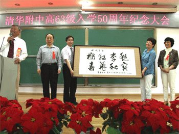 会上,王殿军校长发表了热情洋溢的致辞。激动的老校友们也向母校赠送了一幅由附中前副校长韩家鳌老师书写的书法作品:桃红李艳,春华秋实。在活动中,校友们或相互寒暄,或在已故老校长万邦儒纪念树或铜像前拍照留念,或参观新附中,感受母校50年的巨大变化,或与在校学生们交流,同享学生节的快乐。感恩、追忆、知乐、交流,最终活动取得圆满成功。(摄影:bg真人试玩美术组)